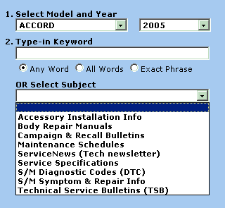 After identifying the vehicle by Model and Year, click on the arrow at the end of the Select Subject drop box, and select the Subject.