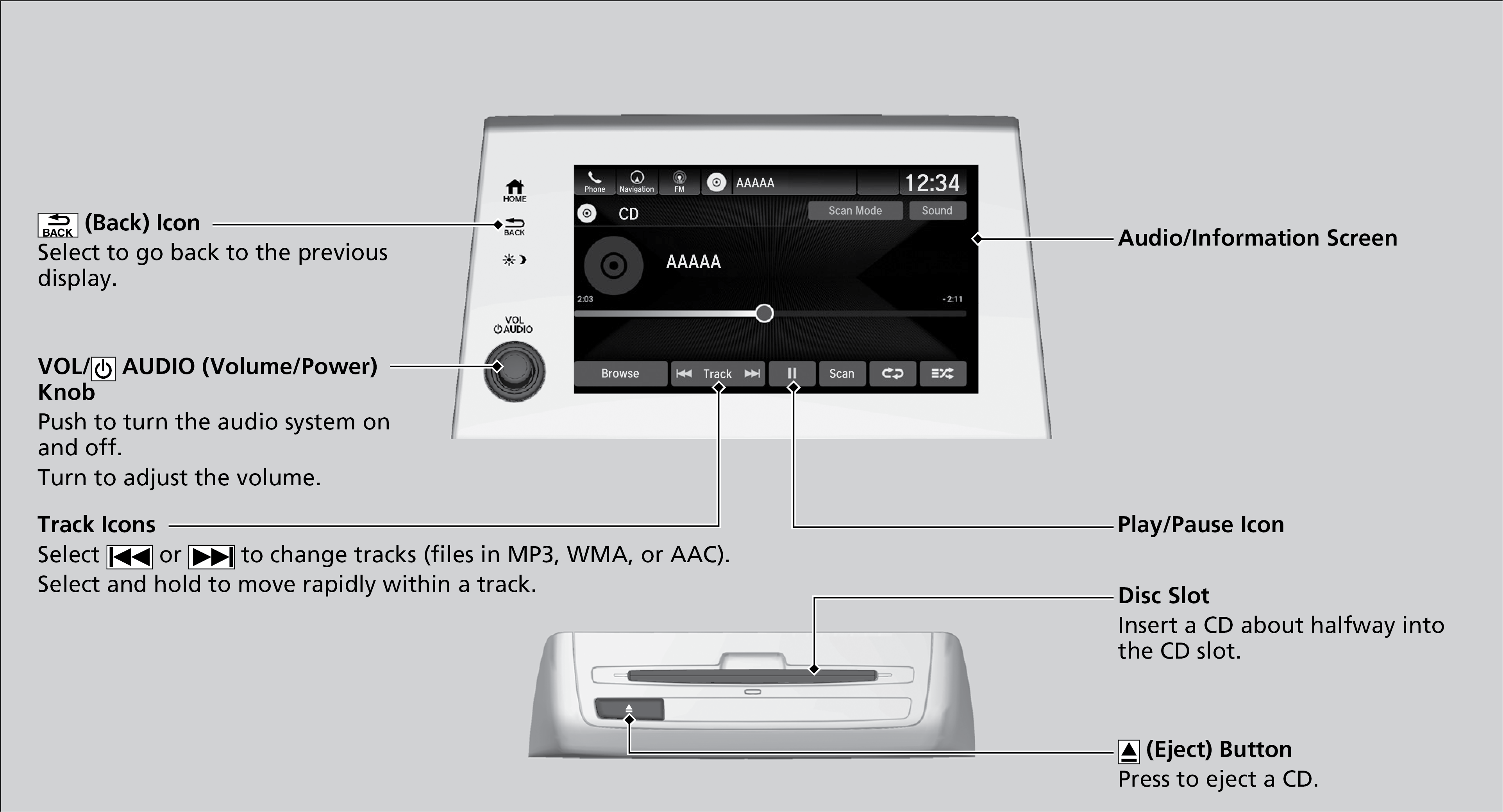 The audio system supports audio CDs, CD-Rs, and CD-RWs in MP3, WMA, or AAC*1 formats. With the CD loaded, select the CD mode.