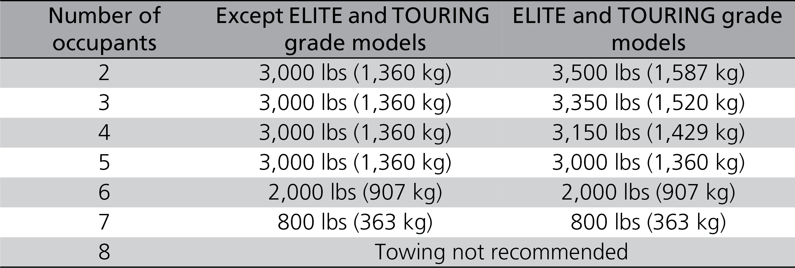 Do not exceed the maximum allowable weight of the trailer, cargo and everything in or on it shown in the table below. Towing loads in excess of this can seriously affect vehicle handling and performance and can damage the engine and drivetrain.