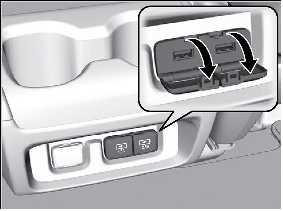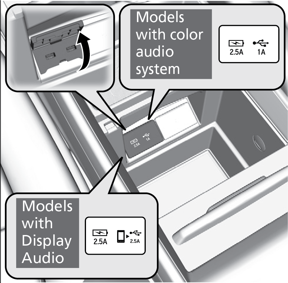 The USB port (2.5A) on the right side is for charging devices, playing audio files and connecting compatible phones with Apple CarPlay or Android Auto.