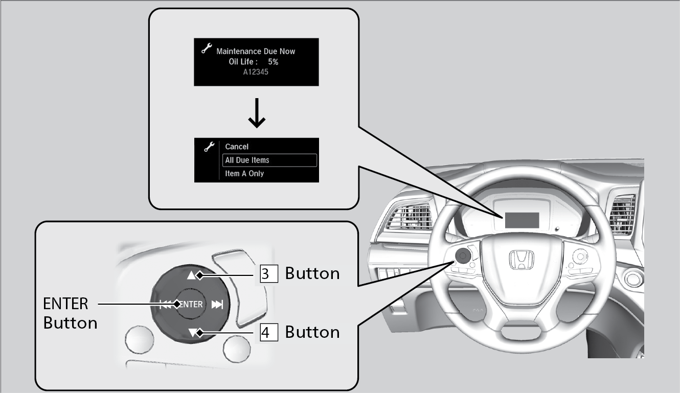 - Press the Up Arrow or Down Arrow on the selector wheel to select a maintenance item to reset or to select All Due Items (You can also select Cancel to end the process).