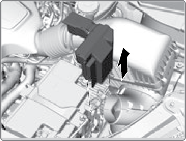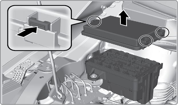 Located at the rear of the engine compartment, on the passenger side. Push the tabs to open the box.