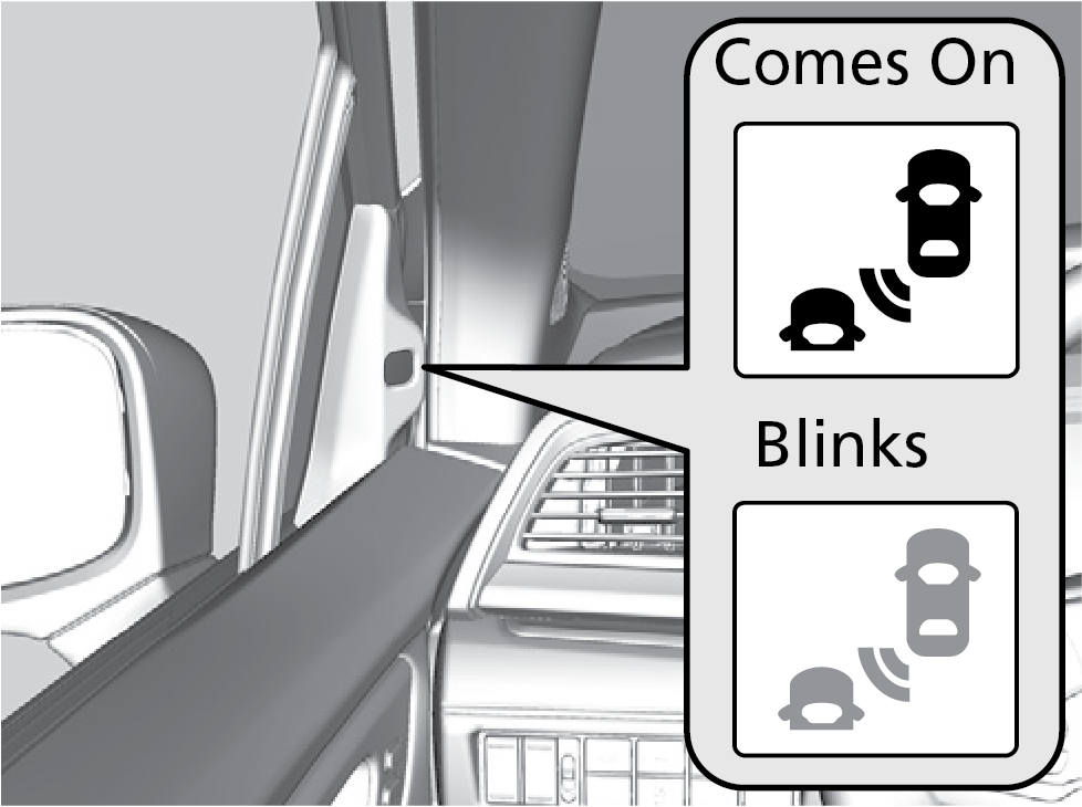When your turn signal is on and a vehicle is detected, the blind spot indicator blinks and a beep sounds until the area is clear or the turn signal is off.
