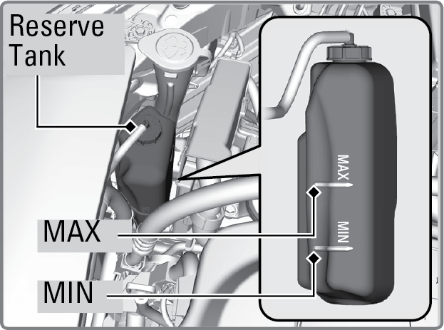 - Once the engine has cooled down, inspect the coolant level and check the cooling system components for leaks. If the coolant level in the reserve tank is low, add coolant until it reaches the MAX mark. If there is no coolant in the reserve tank, make sure the radiator is cool, then cover the radiator cap with a heavy cloth and open the cap. If necessary, add coolant up to the base of the filler neck, and put the cap back on.