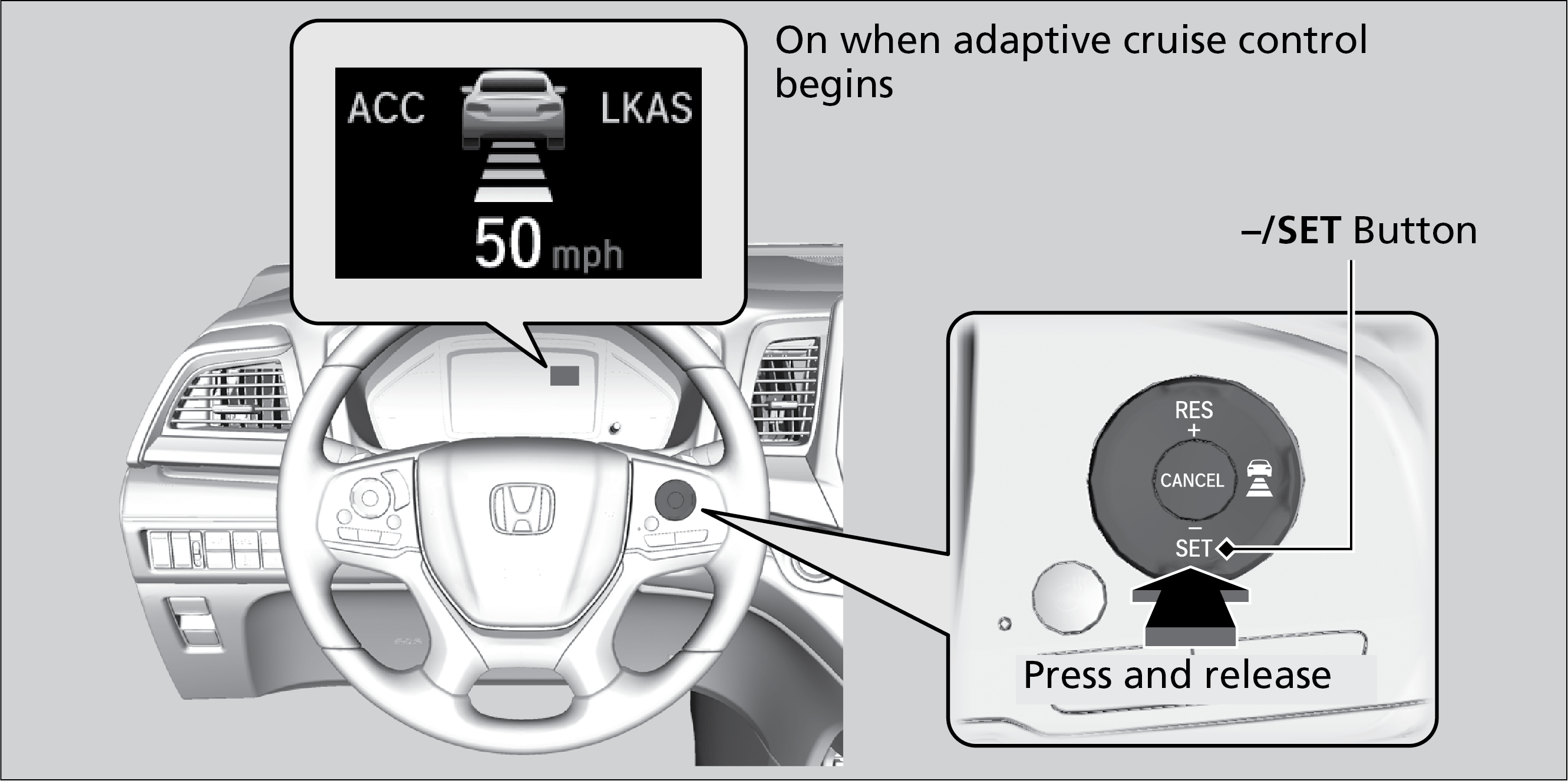 Press the RES/+ button to increase speed or the SET/- button to decrease speed. Each time you press the button, the vehicle speed is increased or decreased by about 1 mph (1.6 km/h). If you keep the button pressed, the vehicle speed increases or decreases by 5 mph or 5 km/h until you release it.