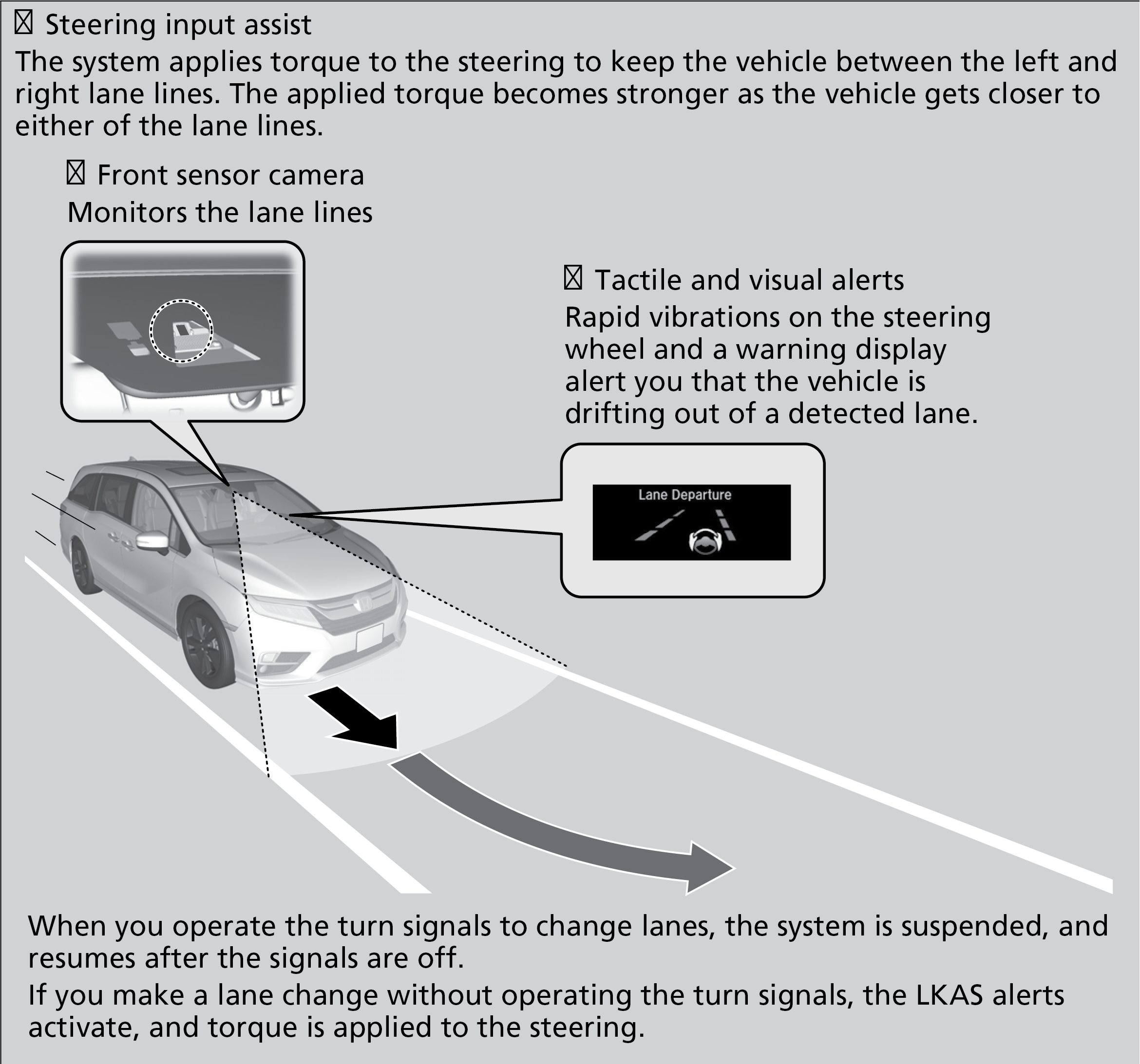 Provides steering input to help keep the vehicle in the middle of a detected lane and provides audible and visual alerts if the vehicle is detected drifting out of its lane while driving between 45–90 mph (72–145 km/h).