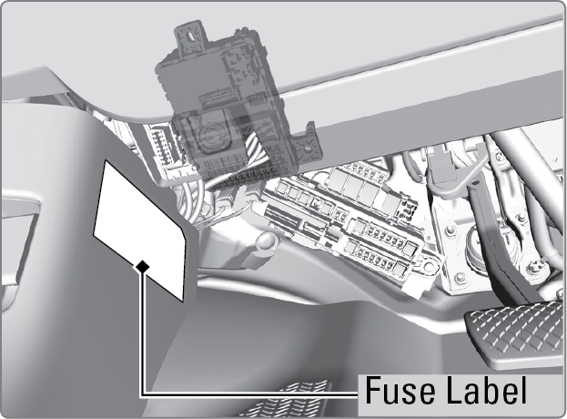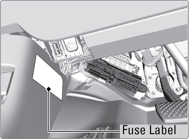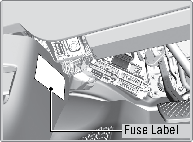 Located under the dashboard (behind the instrument panel). Fuse locations are shown on the label on the side panel (under the steering column). Locate the fuse in question by the fuse number and label number.