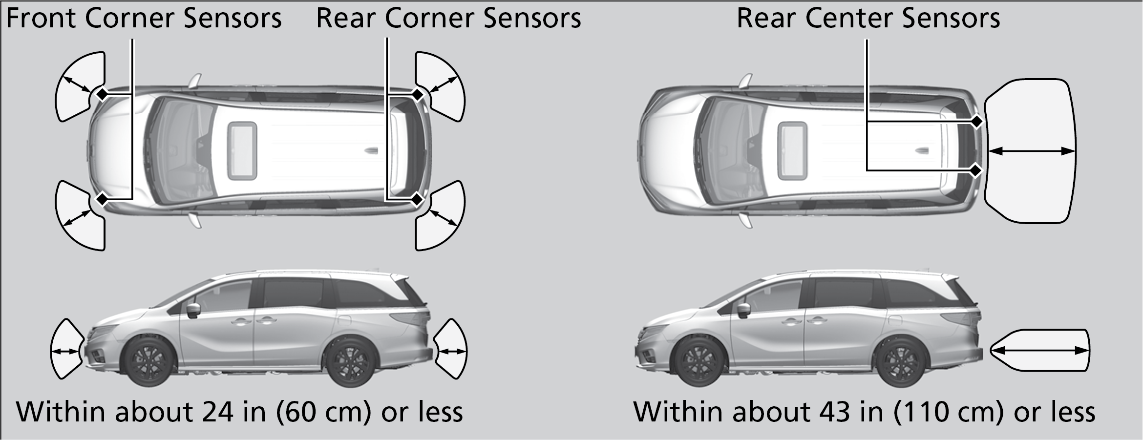 When the system senses an object when you are parking or backing up, indicators appear on the upper display and a series of beeps will sound. As you get closer to the object, the beep rate increases and the screen indicators change from blinking yellow to red.