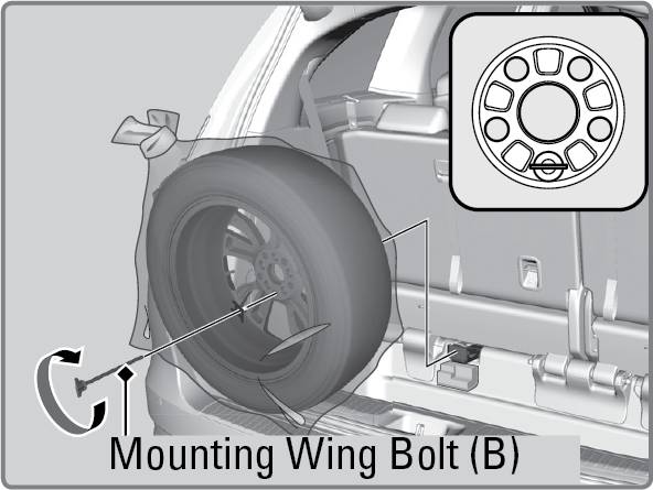 - Put the tire mounting wing bolt (B) in the attachment point through one of the five wheel nut holes, and tighten the bolt. Poke a hole in the storage bag as needed.