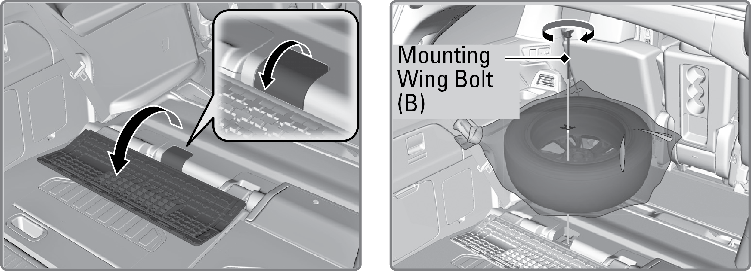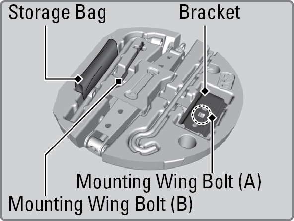 Install the mounting wing bolt (B) to the bracket through one of the five wheel nut holes and tighten the bolt. As needed, poke a hole in the storage bag.