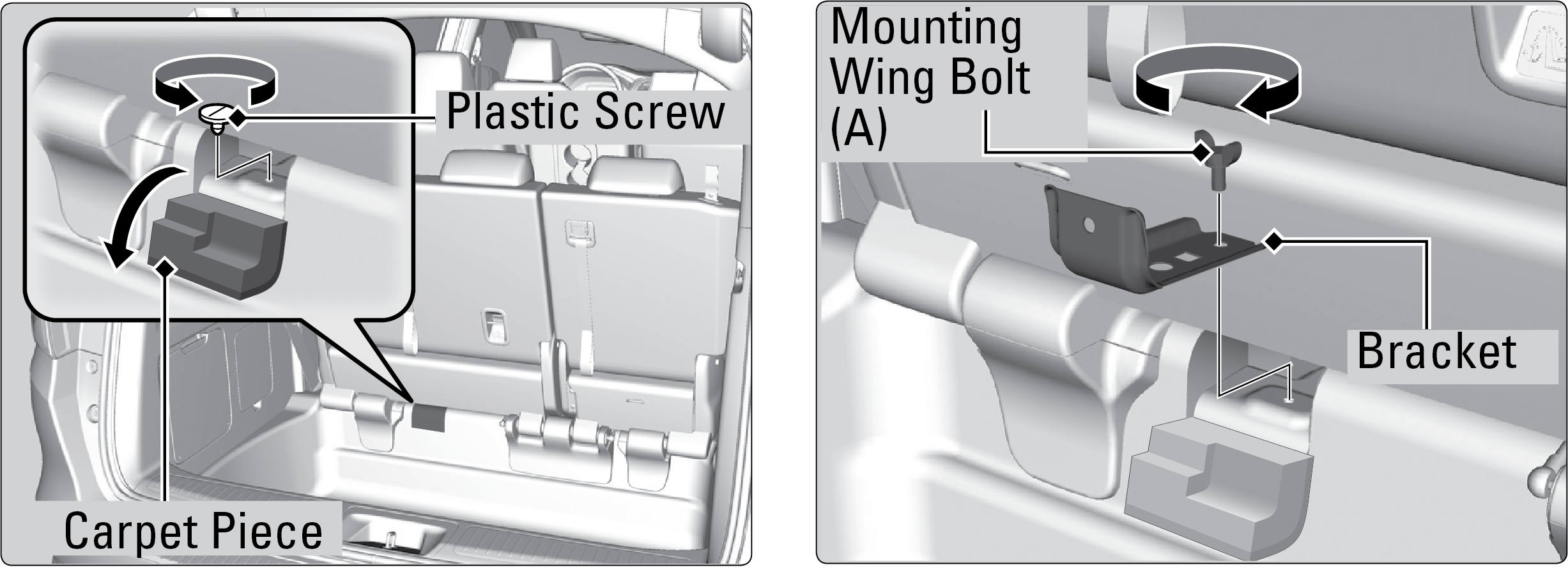 On the driver's side of the third row seat, pull down the U-shaped carpet piece and use a coin to remove the plastic screw. Install the bracket and the mounting wing bolt (A) on the attachment point and tighten the bolt. Install the flat