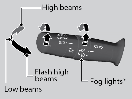 | AUTO: | Turn on the automatic lighting feature. Headlights turn on or off depending on ambient brightness when the vehicle is on. Headlights automatically come on after the wipers are engaged for a certain time. The headlights come on when you unlock a door in dark areas with the headlight switch in AUTO. |