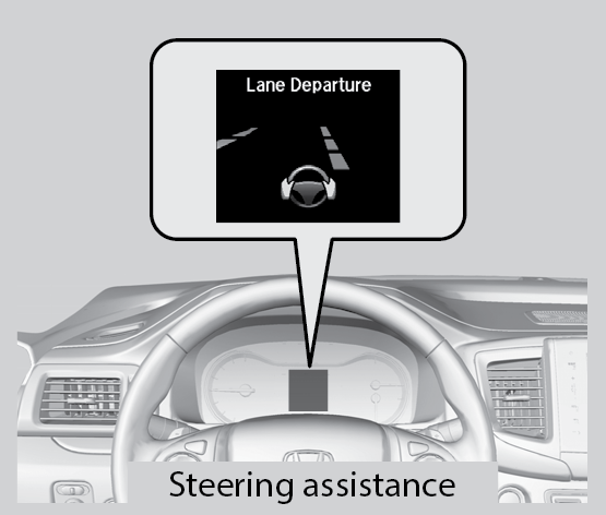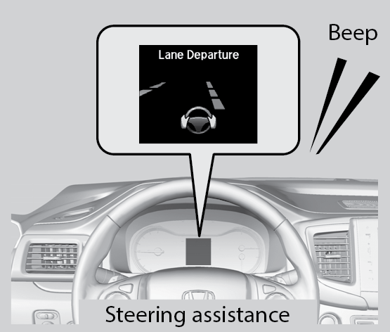 A Lane Departure message appears on the multi-information display, and the steering wheel vibrates. Steering torque is also applied to help keep your vehicle within your driving lane. Take appropriate action to stay within your driving lane.