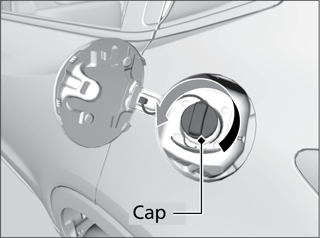 After filling, replace the fuel fill cap, tightening it until you hear it click at least once. Shut the fuel fill door by hand.