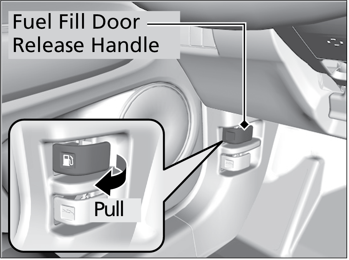 handle under the driver’s side lower outside corner of the dashboard . The fuel fill door opens.