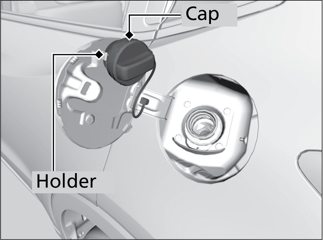 Remove the fuel fill cap slowly. If you hear a release of air, wait until this stops, then turn the knob slowly to open the fuel fill cap. Place the fuel fill cap in the holder.