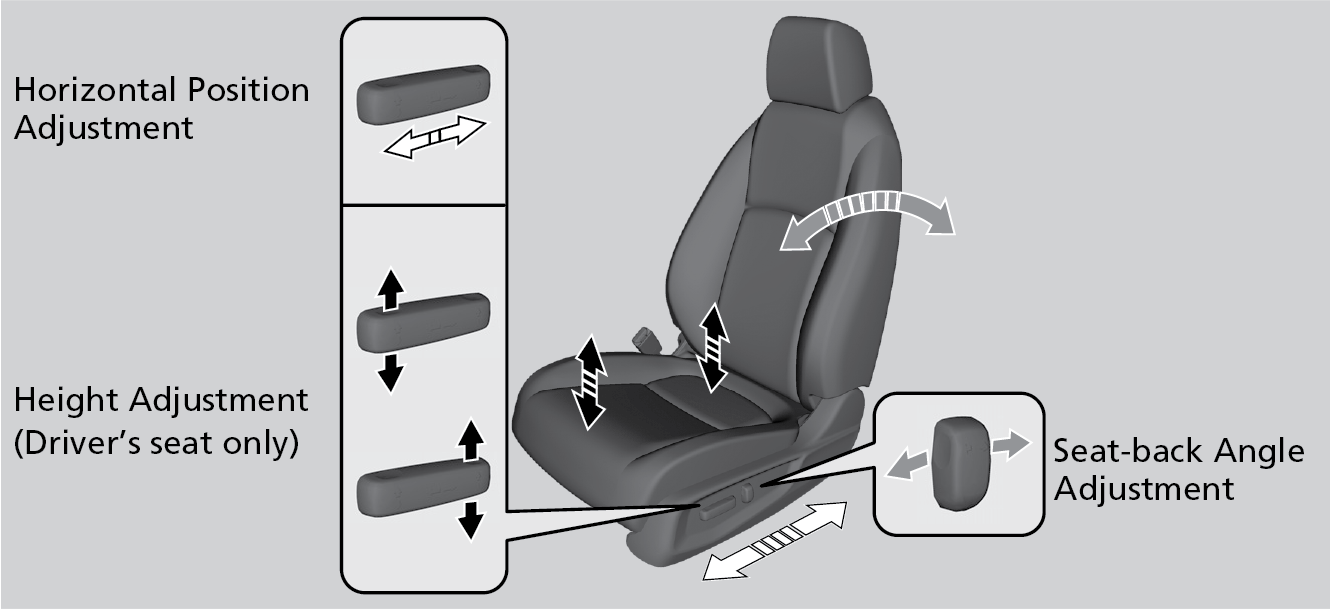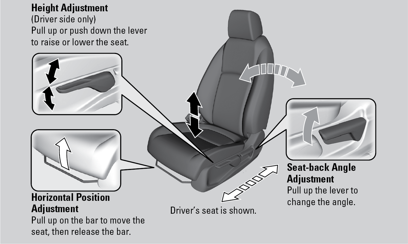 Adjust the driver’s seat as far back as possible while allowing you to maintain full control of the vehicle. You should be able to sit upright and well back in the seat, adequately press the pedals without leaning forward, and grip the steering wheel comfortably. The passenger’s seat should be adjusted so that it is as far back from the front airbag in the dashboard as possible.