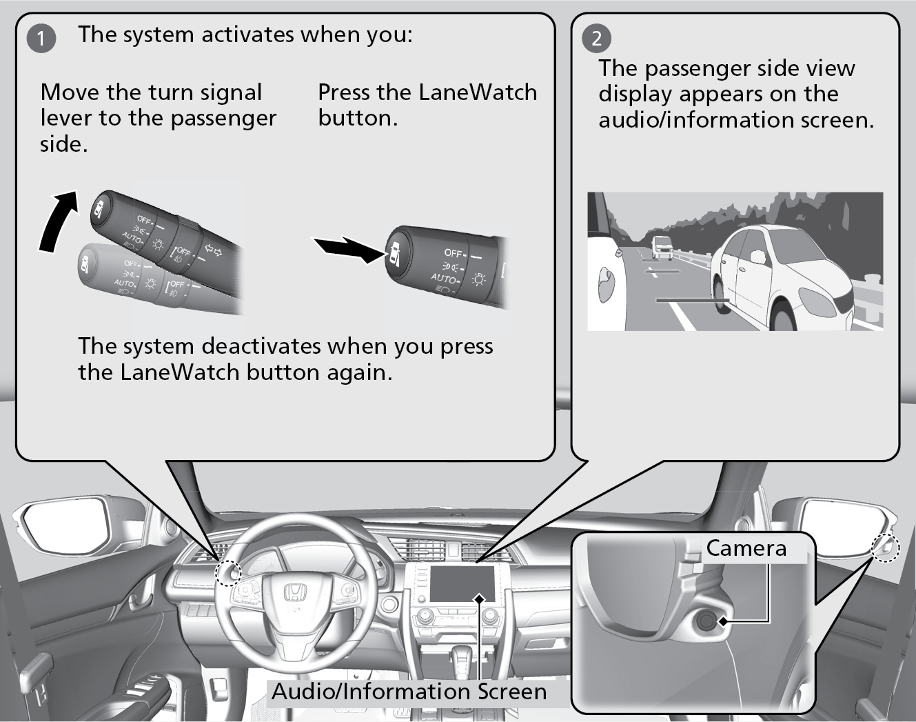 Allows you to check the passenger side rear areas displayed on the audio/information screen when the turn signal is activated to the passenger’s side.