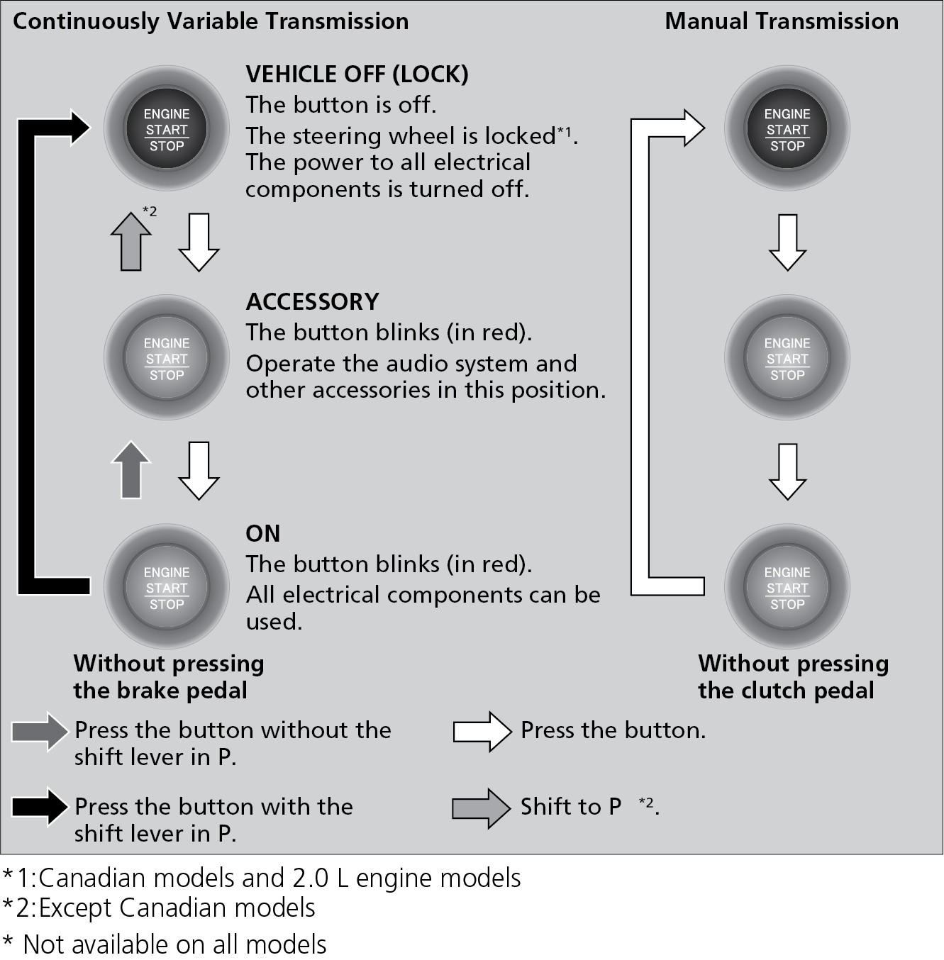 Accessory or On mode: Press the ENGINE START/STOP button once without pressing the brake pedal for Accessory mode. Press it again for On mode.