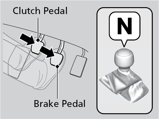 - Check that the shift lever is in Neutral. Then depress the brake pedal with your right foot, and the clutch pedal with your left foot.