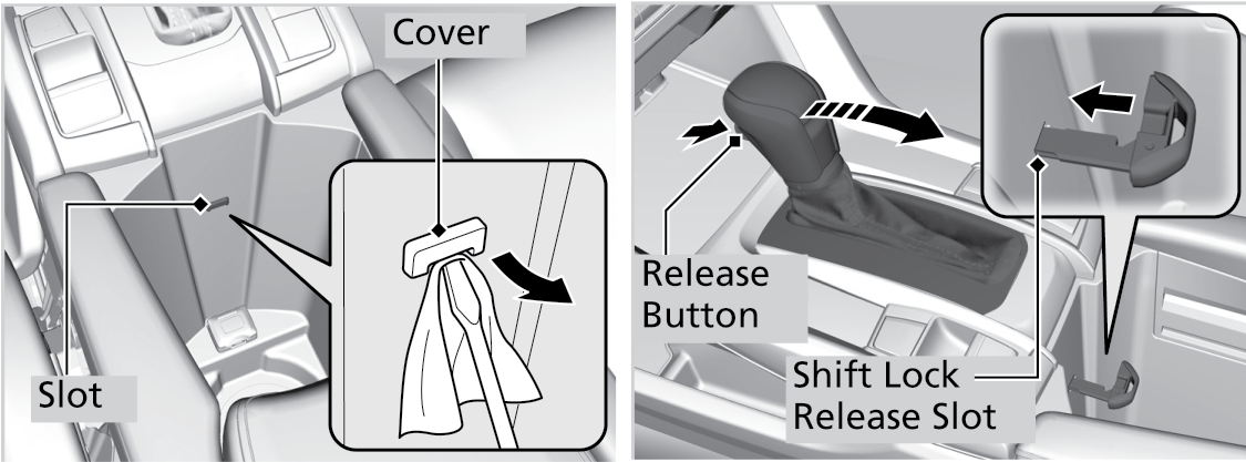 - Wrap a cloth around the tip of a small flat-tip screwdriver. Put it into the shift lock release slot as shown in the image, and remove the cover.