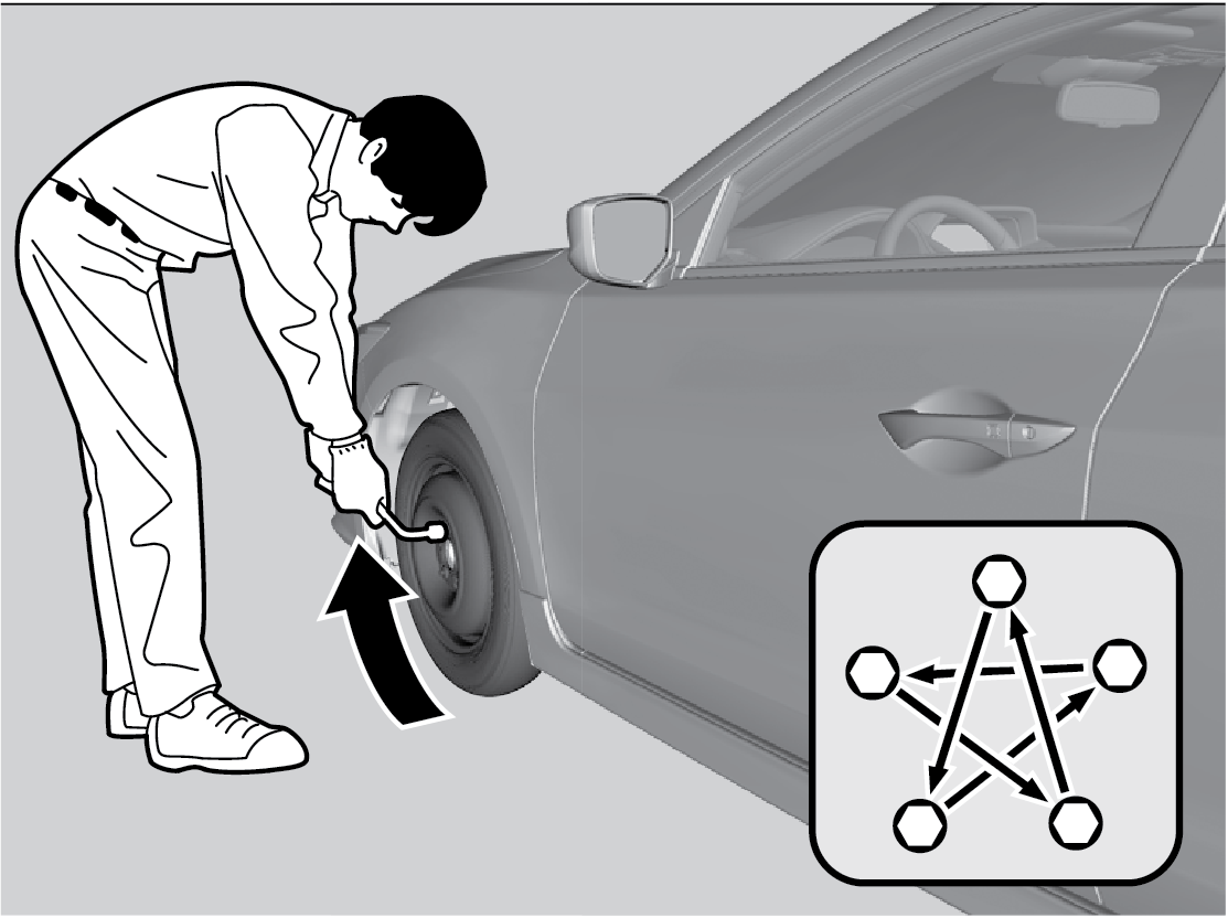 - Lower the vehicle and remove the jack. Tighten the wheel nuts in the order indicated in the image. Go around, tightening the nuts, two to three times in this order. Do not overtighten the wheel nuts.
