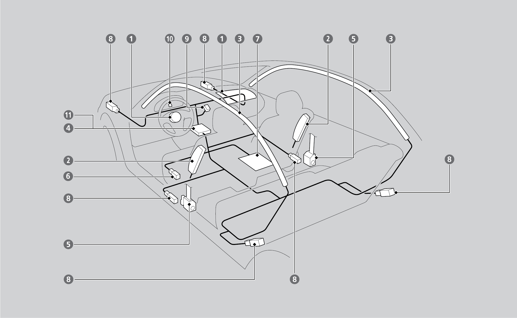 Two side curtain airbags, one for each side of the vehicle. The airbags are stored in the ceiling, above the side windows. The front and rear pillars are marked SIDE CURTAIN AIRBAG.