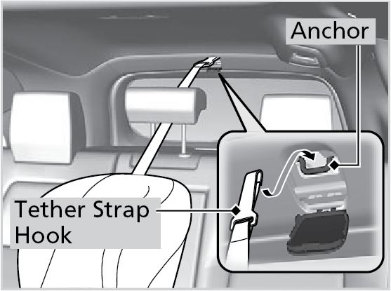 Raise the outer head restraint to its highest position, then route the tether strap between the head restraint legs. Make sure the strap is not twisted.