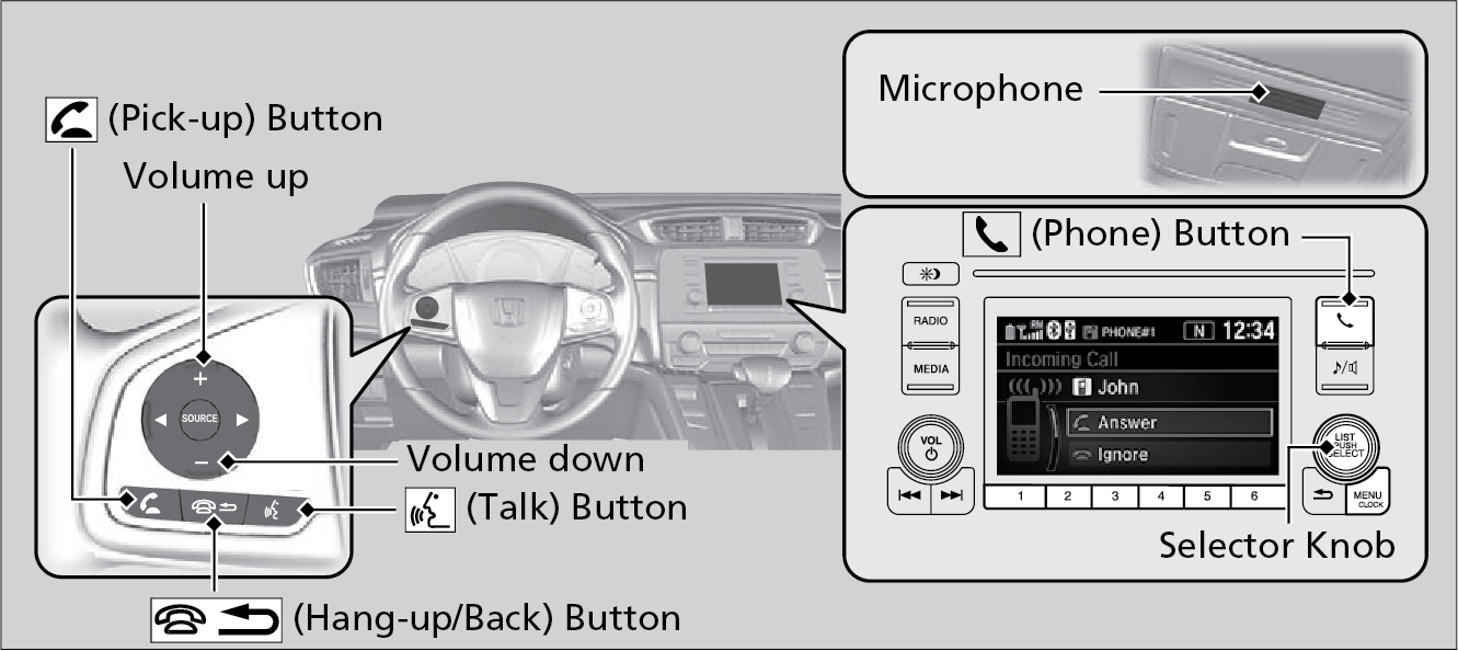 | Pick-up button: | Press to go directly to the phone menu on the driver information interface, or to answer an incoming call. |