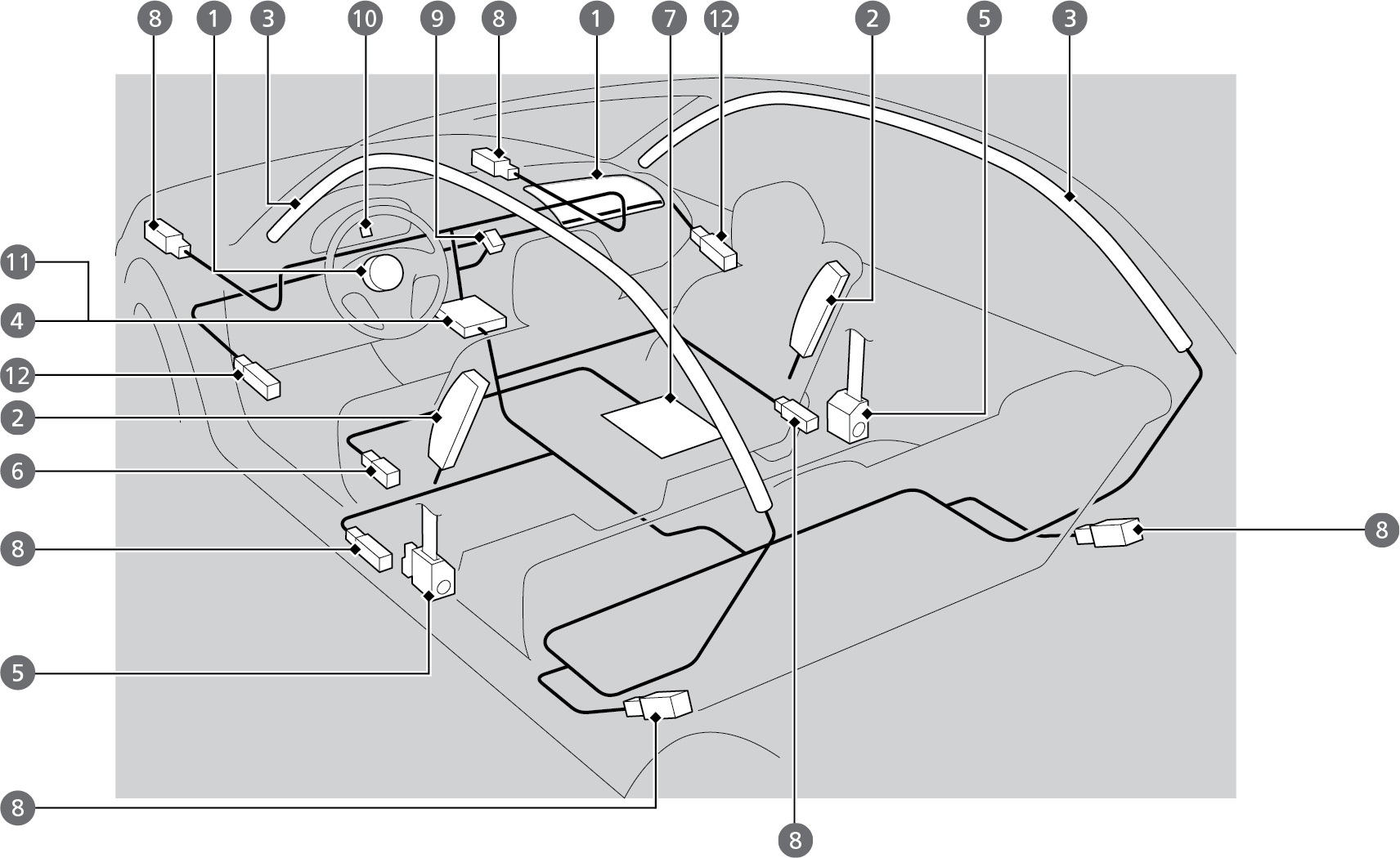 Two side curtain airbags, one for each side of the vehicle. The airbags are stored in the ceiling, above the side windows. The front and rear pillars are marked SIDE CURTAIN AIRBAG.