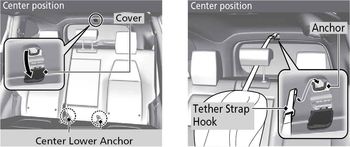 Put the center head restraint to its highest position, open the anchor cover, then route the tether strap between the head restraint legs, and secure the tether strap hook to the anchor. Make sure the strap is not twisted.