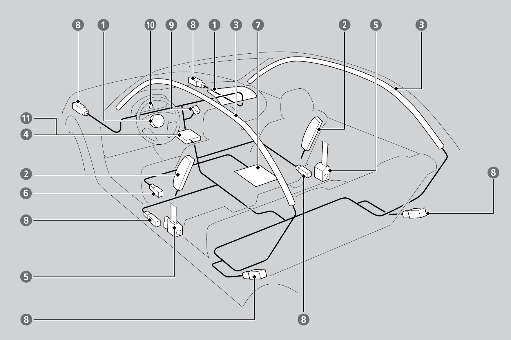 Two side curtain airbags, one for each side of the vehicle. The airbags are stored in the ceiling, above the side windows. The front and rear pillars are marked SIDE CURTAIN AIRBAG.