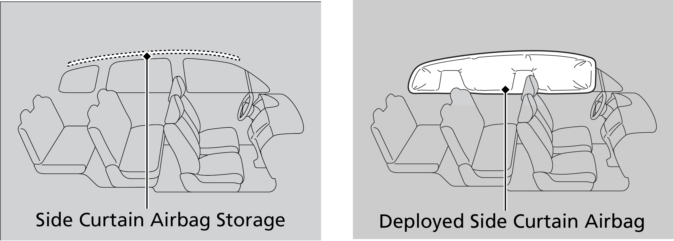 The side curtain airbags are deigned to deploy in a rollover or moderate-to-severe side impact. If the SRS control unit senses that your vehicles is about to roll over, it immediately deploys both side curtain airbags and activates both front seat belt tensioners. If the impact is on the passenger's side, the passenger's side curtain airbag will inflate even if there are no occupants on that side of the vehicle.