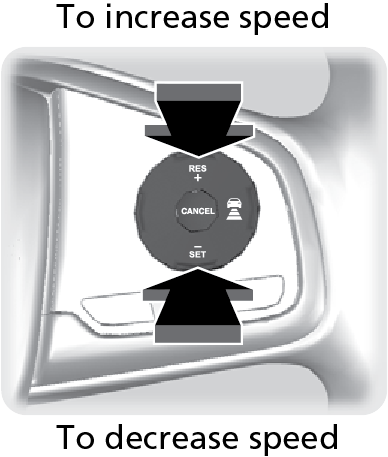 Press the RES/+ button to increase speed or the SET/- button to decrease speed. Each time you press the button, the vehicle speed is increased or decreased by about 1 mph (1.6 km/h). If you keep the button pressed, the vehicle speed increases or decreases by 5 mph or 5 km/h until you release it.