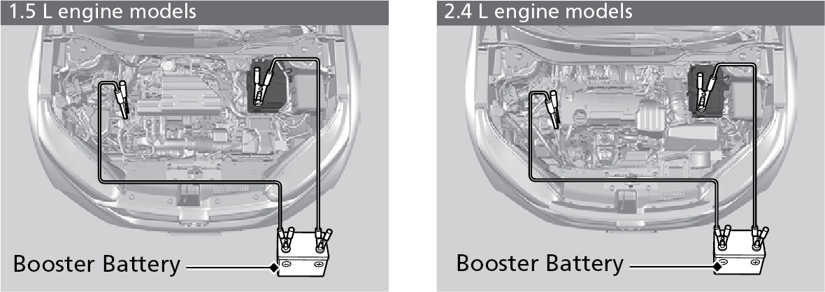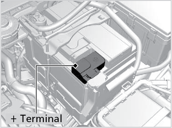 - Connect the other end of the first jumper cable to the booster battery (+) terminal. Use a 12-volt booster battery only.