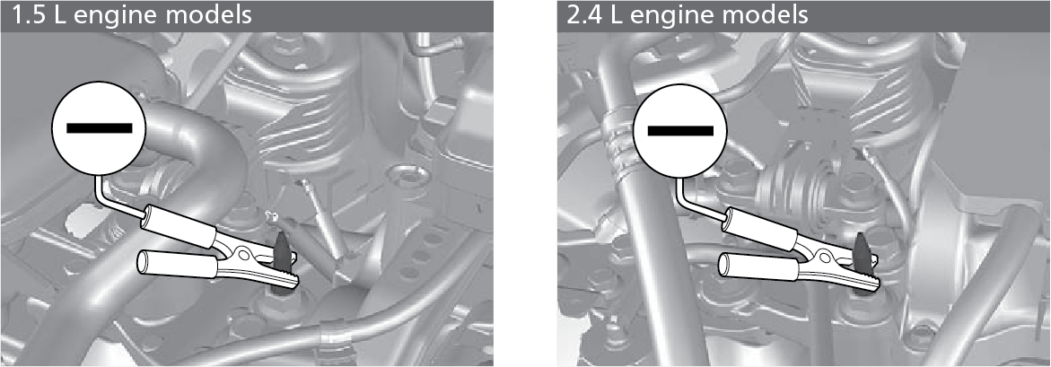 - Connect the second jumper cable to the booster battery (-) terminal.
