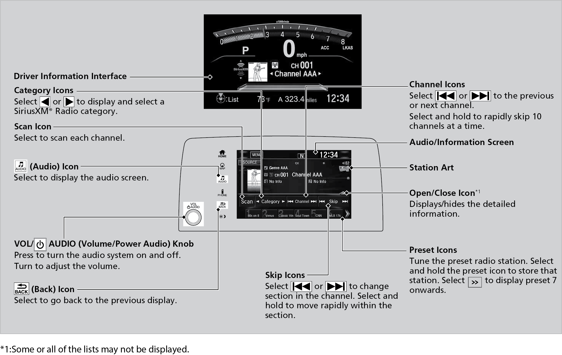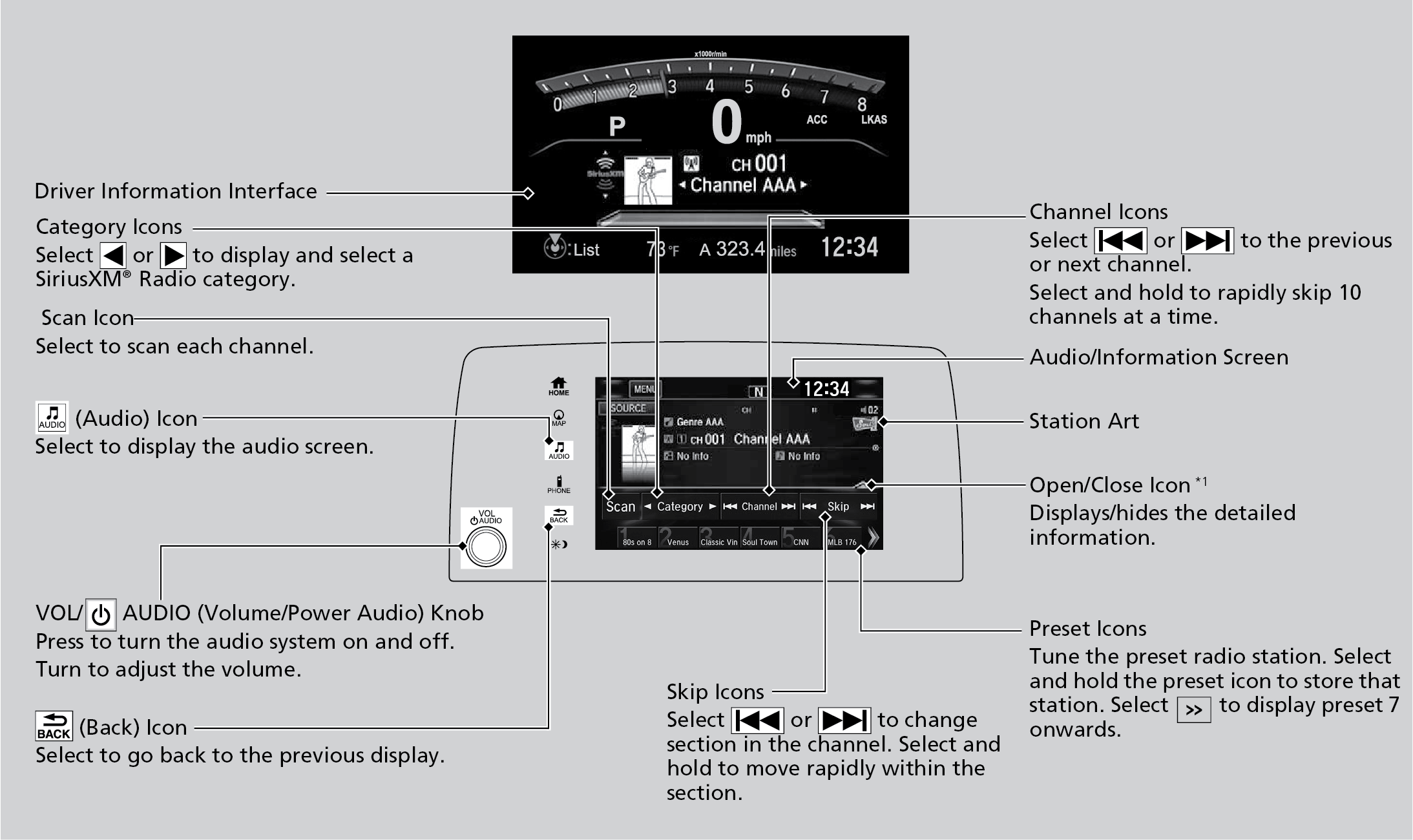 To learn about additional features—such as multi-channel preset, replay, or SportsFlash—see your Owner’s Manual at owners.honda.com (U.S.) or myhonda.ca (Canada).