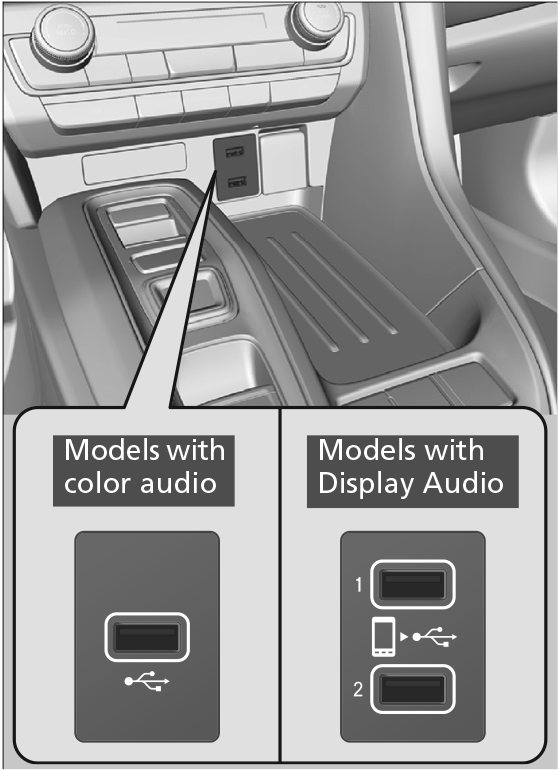 The USB ports (2.5A) are for charging devices, playing audio files and connecting compatible phones with Apple Carplay™ or Android Auto™.
