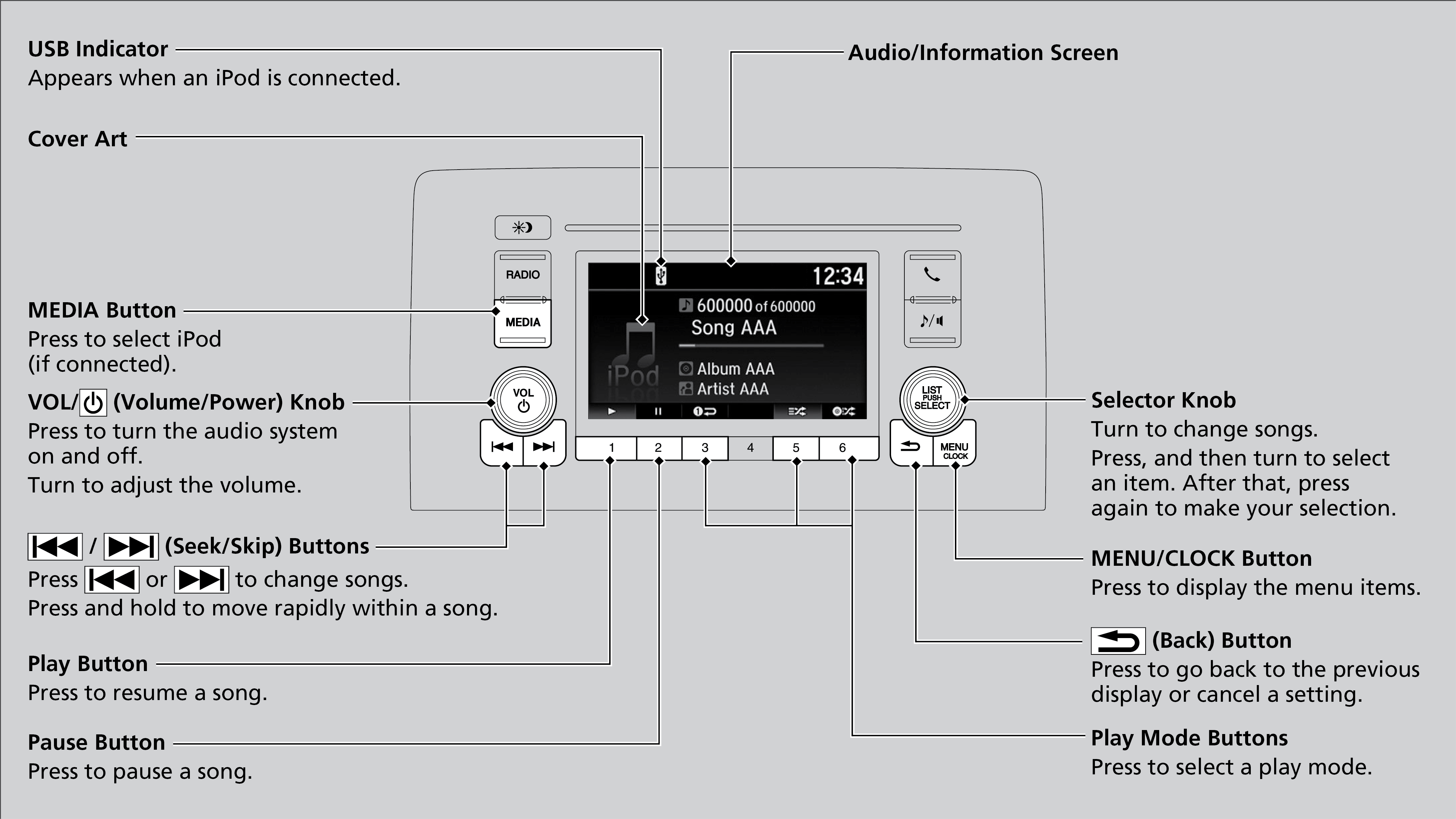 Play and operate an iPod®*14 through the vehicle’s audio system. Connect your device to the USB port (see USB Port).