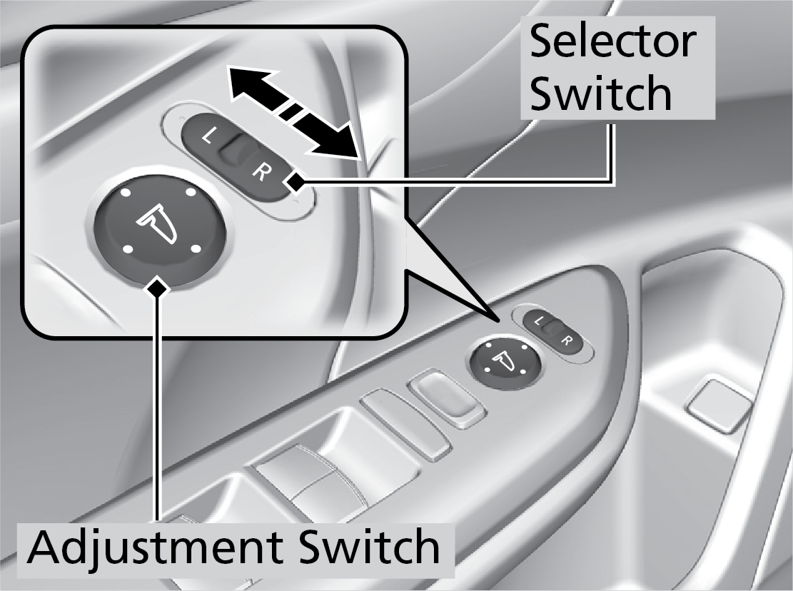 Mirror position adjustment switch: Press the switch left, right, up, or down to move the mirror.