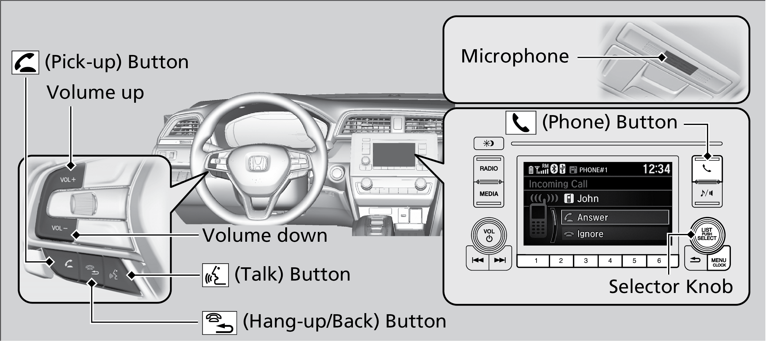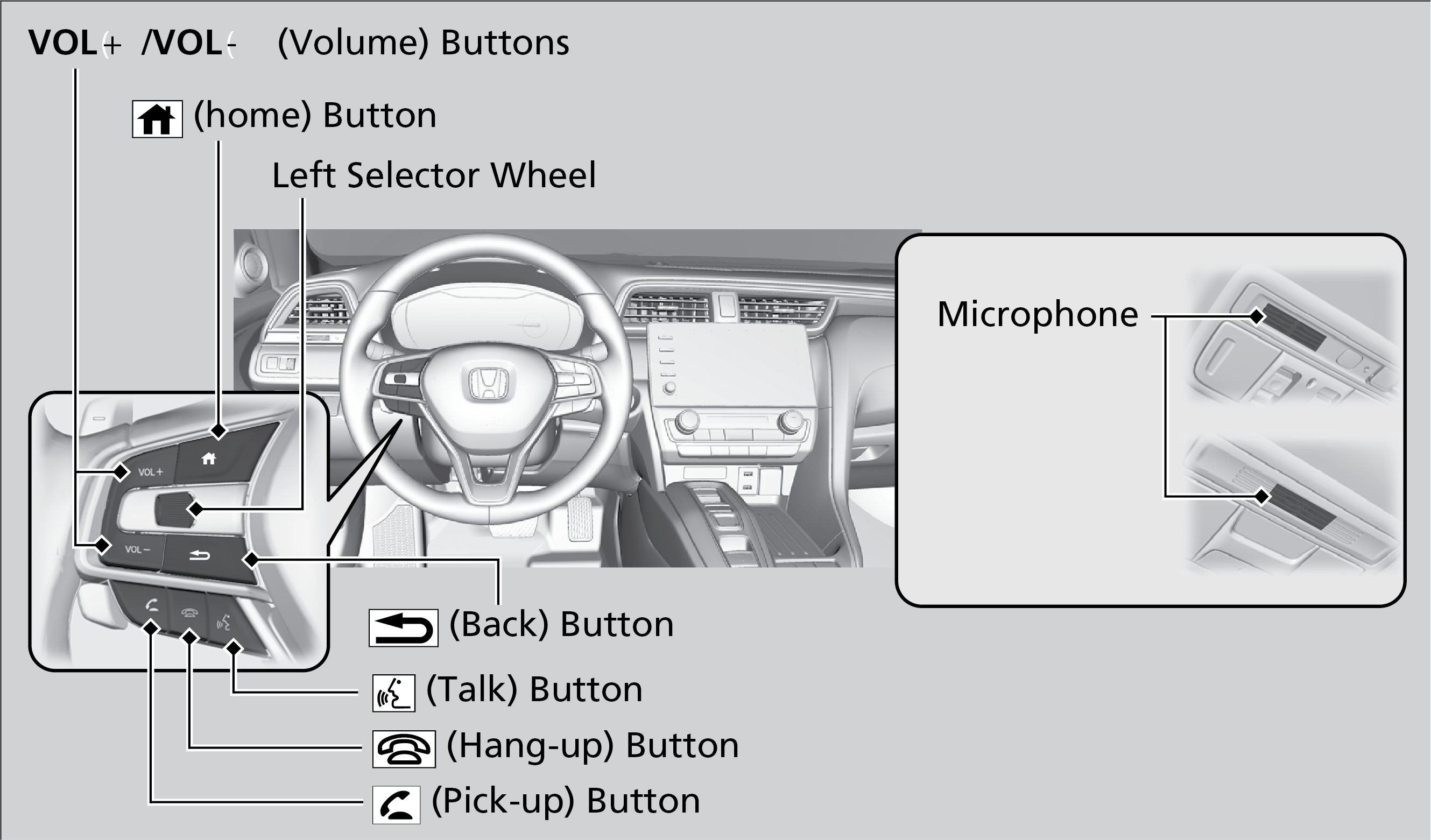 | Left Selector Wheel: | Press home button, then roll up or down to select Phone on the driver information interface, and then press the left selector wheel. |