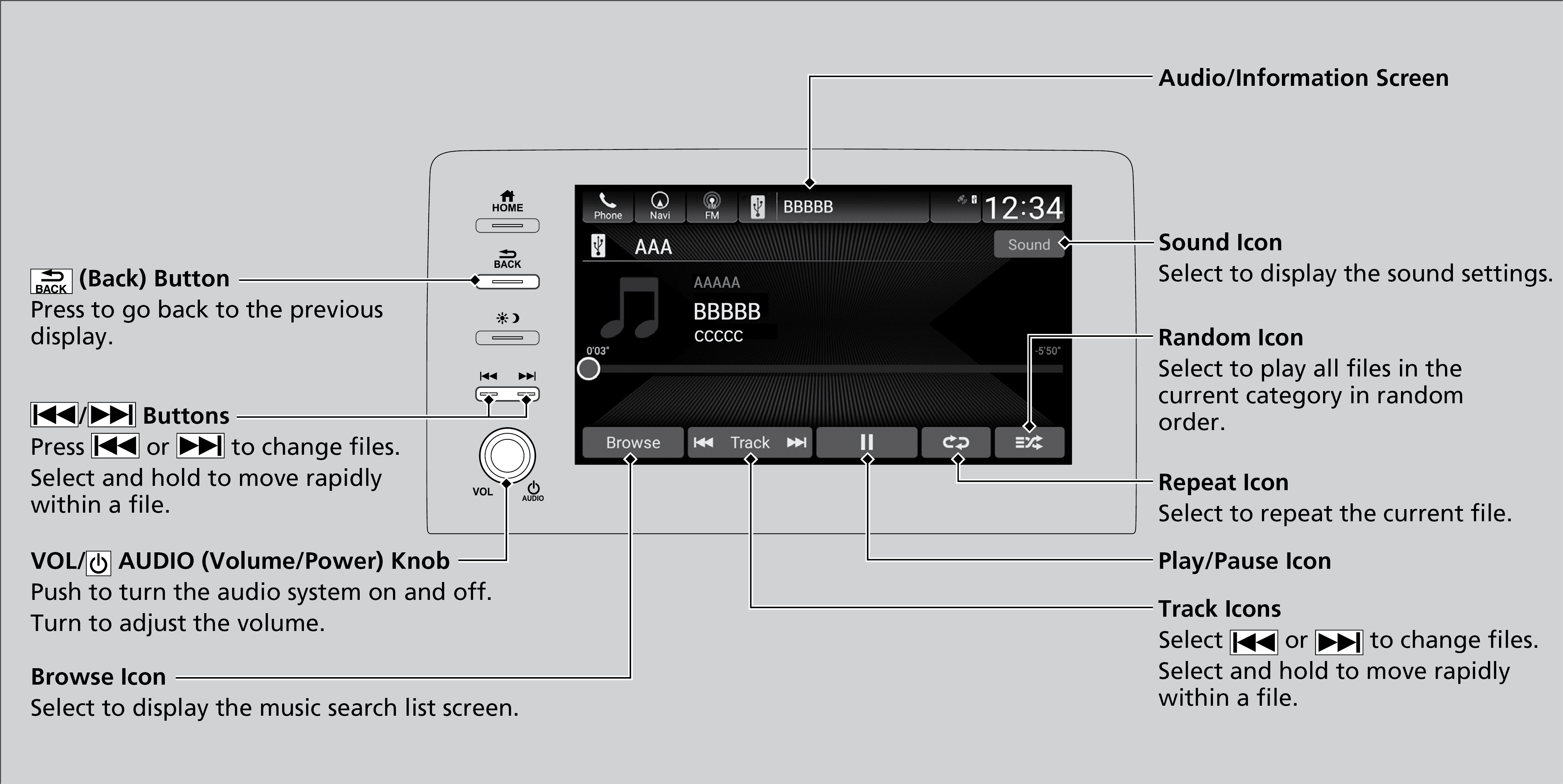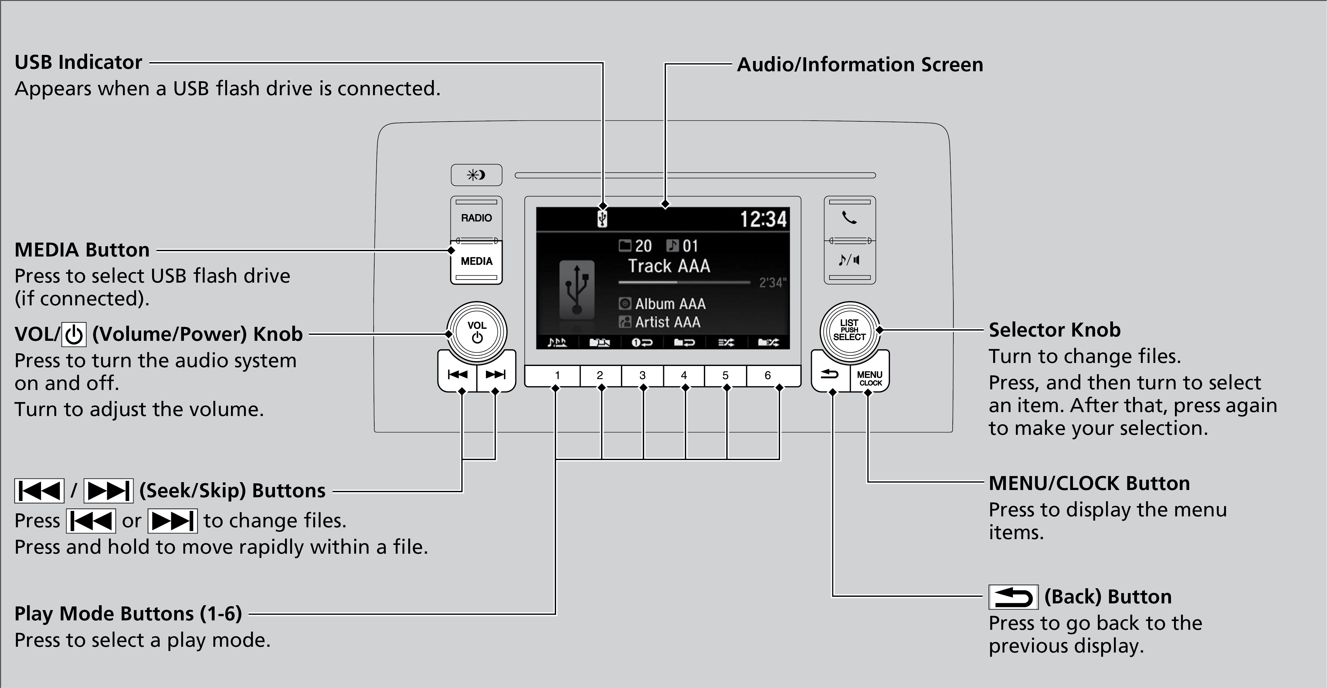 Your audio system reads and plays sound files on a USB flash drive in either MP3, WMA, or WAV format. Connect your USB flash drive to the USB port , then press the MEDIA button.