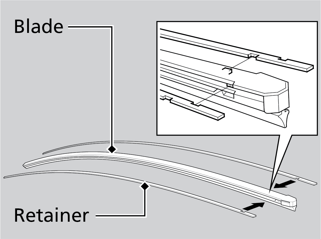 - Slide the wiper blade out of the holder by pulling the tabbed end out.Remove the retainers from the wiper blade that has been removed, and mount to a new wiper blade. Correctly align the wiper blade protrusion and the retainer grooves.