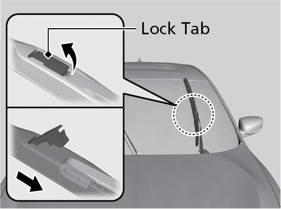 - Place a cloth on the edge of the lock tab. Push the lock tab up with a flat tip screw driver and slide the blade from the wiper arm.