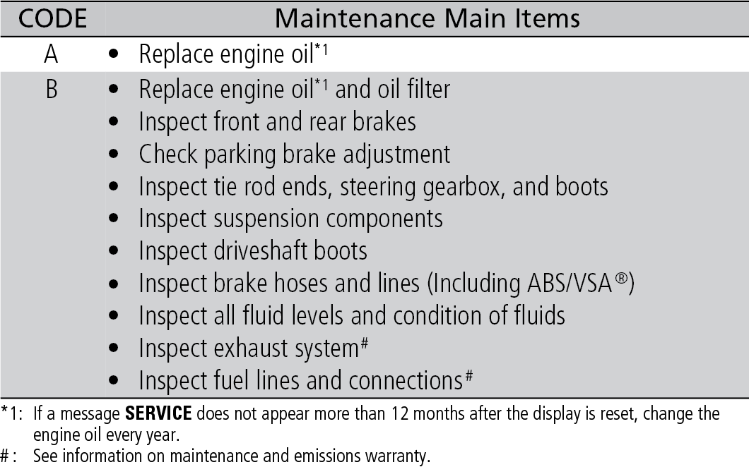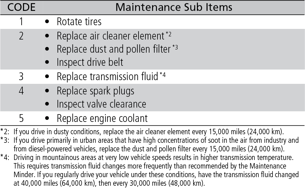 Maintenance Minder Service Codes