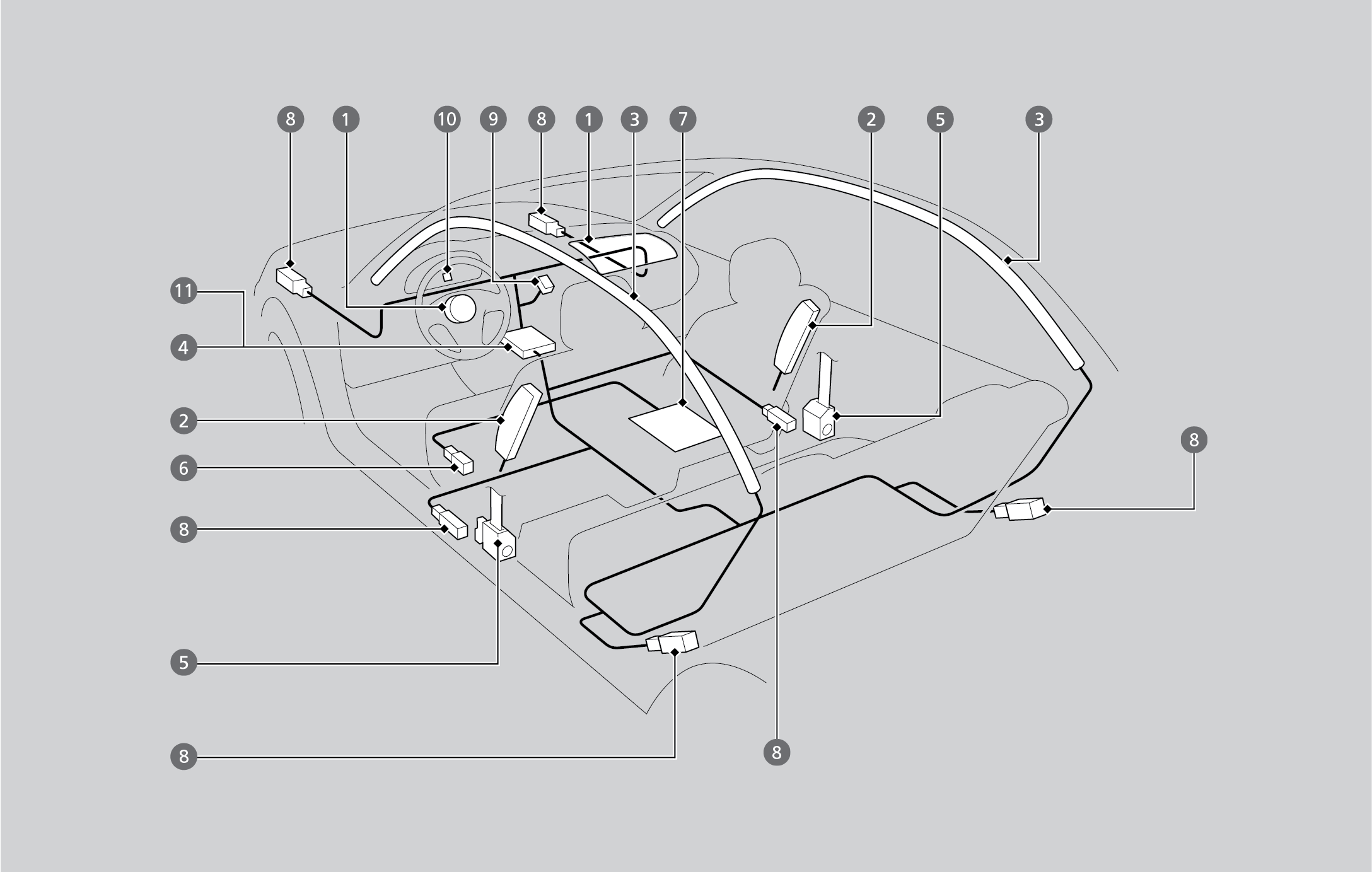 Two side curtain airbags, one for each side of the vehicle. The airbags are stored in the ceiling, above the side windows. The front and rear pillars are marked SIDE CURTAIN AIRBAG.