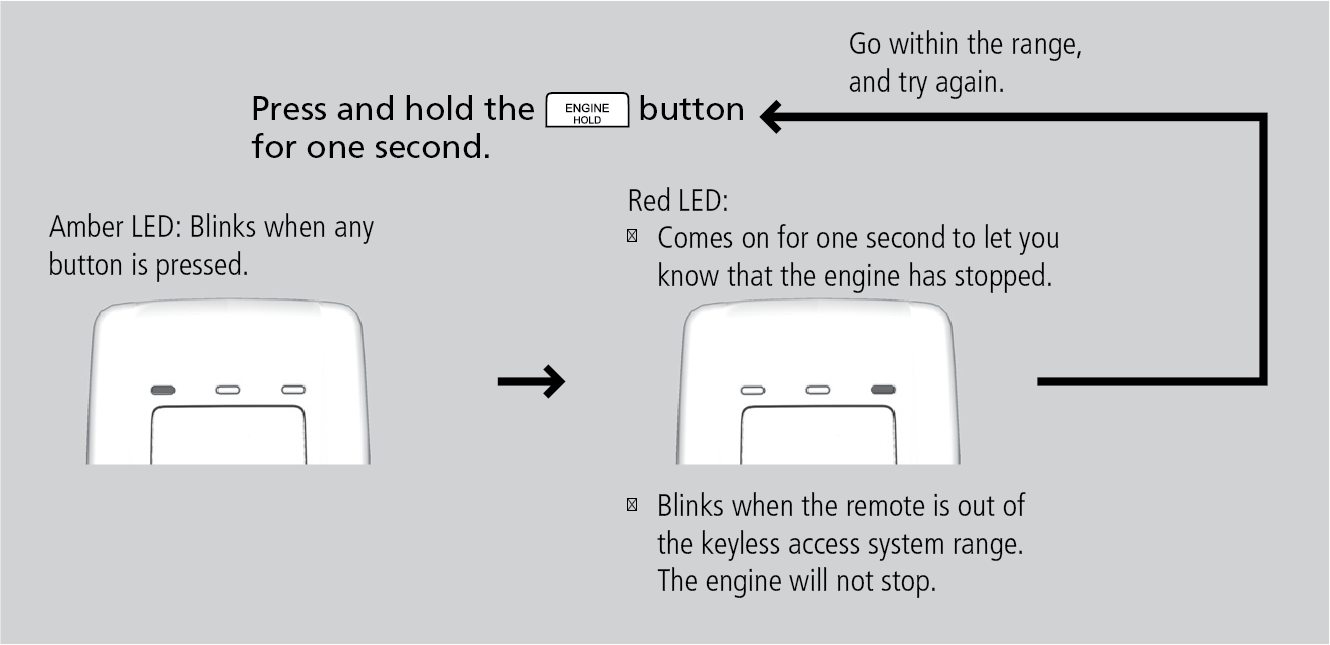 When started remotely, the engine shuts off after 10 minutes of idling. It will also stop if the ENGINE START/STOP button and the brake are pressed individually.