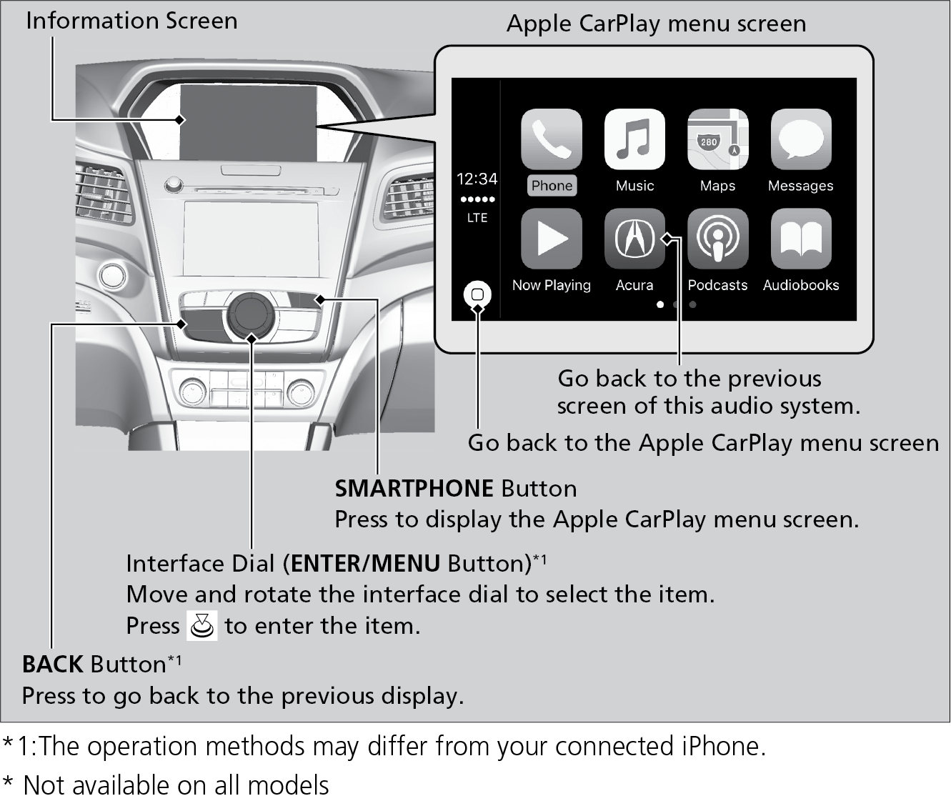 If you connect an Apple CarPlay™-compatible iPhone® to the system via the USB port, you can use the information screen, instead of the iPhone® display, to make a phone call, listen to music, view maps (navigation), and access messages.