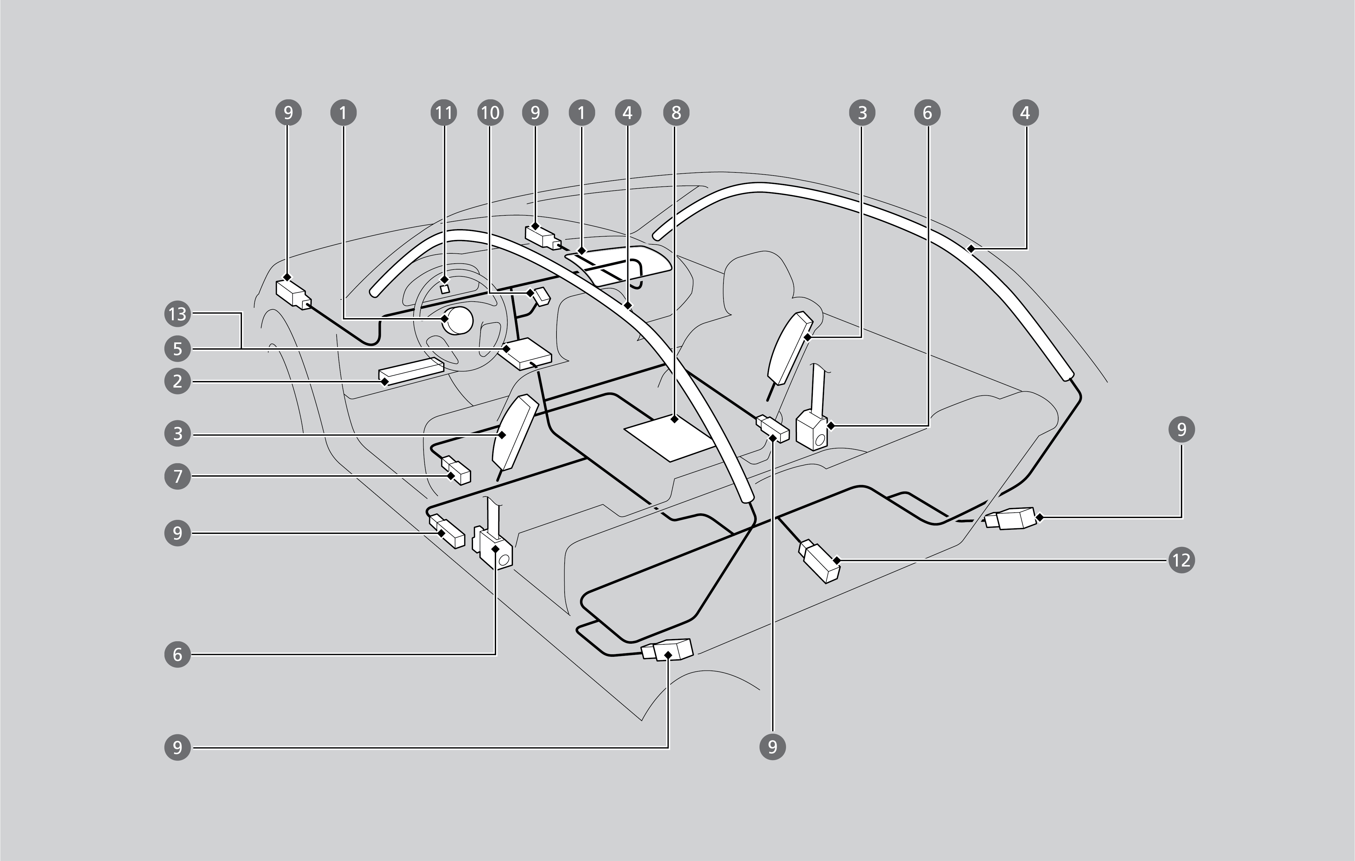 Two side curtain airbags, one for each side of the vehicle. The airbags are stored in the ceiling, above the side windows. The front and rear pillars are marked SIDE CURTAIN AIRBAG.