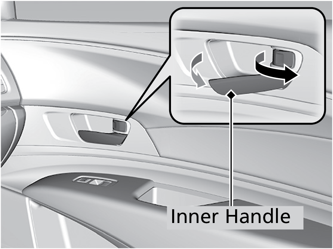 Pull the front door inner handle. The door unlocks and opens in one motion. Unlocking and opening the driver’s door from the inner handle unlocks all other doors.